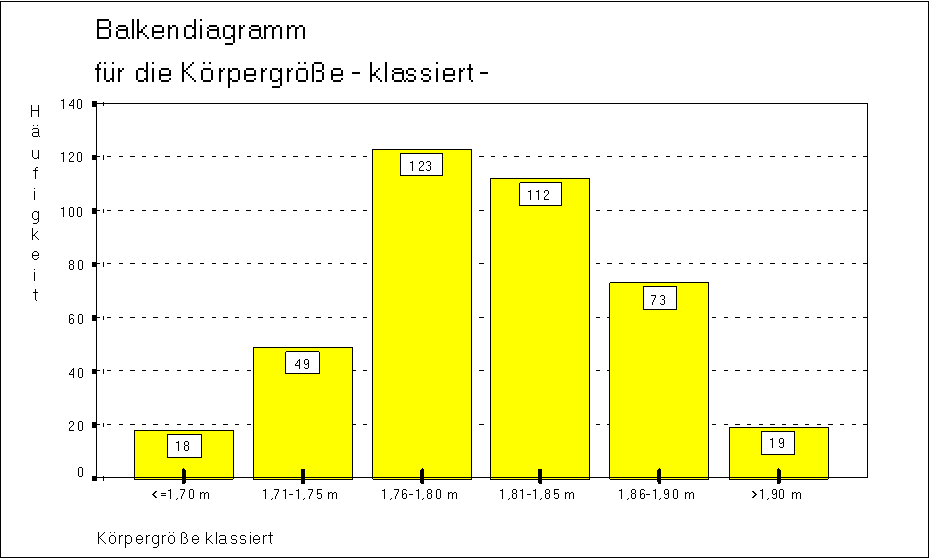 Zu besseren Übersicht wurden auch hier die Daten klassiert. Aus dem Balkendiagramm kann ersehen werden, daß die meisten Spieler , nämlich 123, zwischen 1,76 m und 1,80 m groß sind.