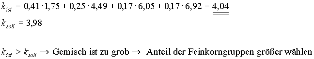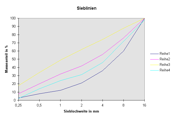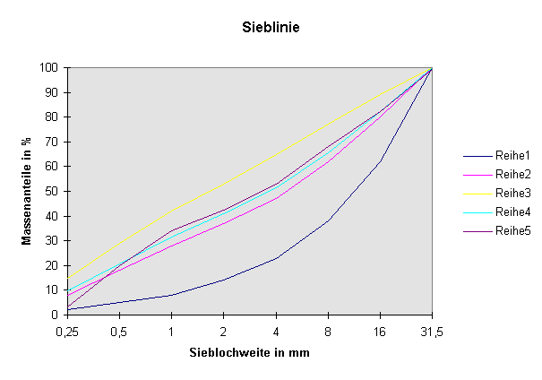 Ein klares Bild der Kornzusammensetzung ergibt die graphische Darstellung der Siebdurchgänge: die Sieblinie. Um diese aus dem Gemisch der Proben zu ermitteln, wurden die vorhergehenden Rechnungen durchgeführt.