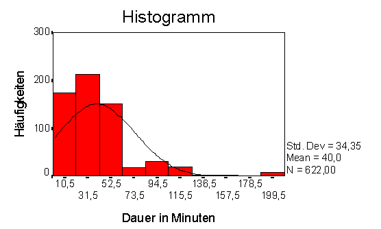 Der empirische Momentenkoeffizient der Schiefe von 2,117 besagt, daß die empirische Verteilung rechtsschief ist, d. h. die Differenz vom 3. Quartil und dem Median ist größer als die Differenz vom Median und dem 1. Quartil. Dieses spiegelt sich auch im folgenden Histogramm wider. Zur Erstellung des Histogramms bildeten wir zehn Klassen und legten anschließend die Normalverteilungskurve darüber.
