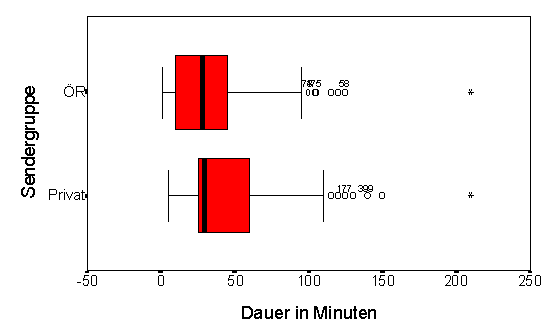 In unserer Auswertung sind die Unterschiede in den Quartilsabständen gut ersichtlich. So beträgt z. B. die Differenz zwischen dem 2. Quartil (Median) und dem 1. Quartil bei den Privaten lediglich fünf Min., während diese bei den Öffentlich-Rechtlichen 18 Min. beträgt. Auf der anderen Seite beträgt die Differenz zwischen dem 3. Quartil und dem Median bei den Privaten 30 Min. und bei den Öffentlich-Rechtlichen nur 17 Min. Dies bedeutet, daß die Privaten eine größere Anzahl an längeren Sendungen ausstrahlen.