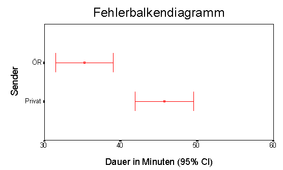 Der Mittelwert der öffentlich-rechtlichen Anstaltengruppen beträgt 35,276 Min., der der privaten 45,745 Min., d. h. daß die Sendedauer pro Sendung der Privaten im Durchschnitt ca. 10 Min. länger ist.