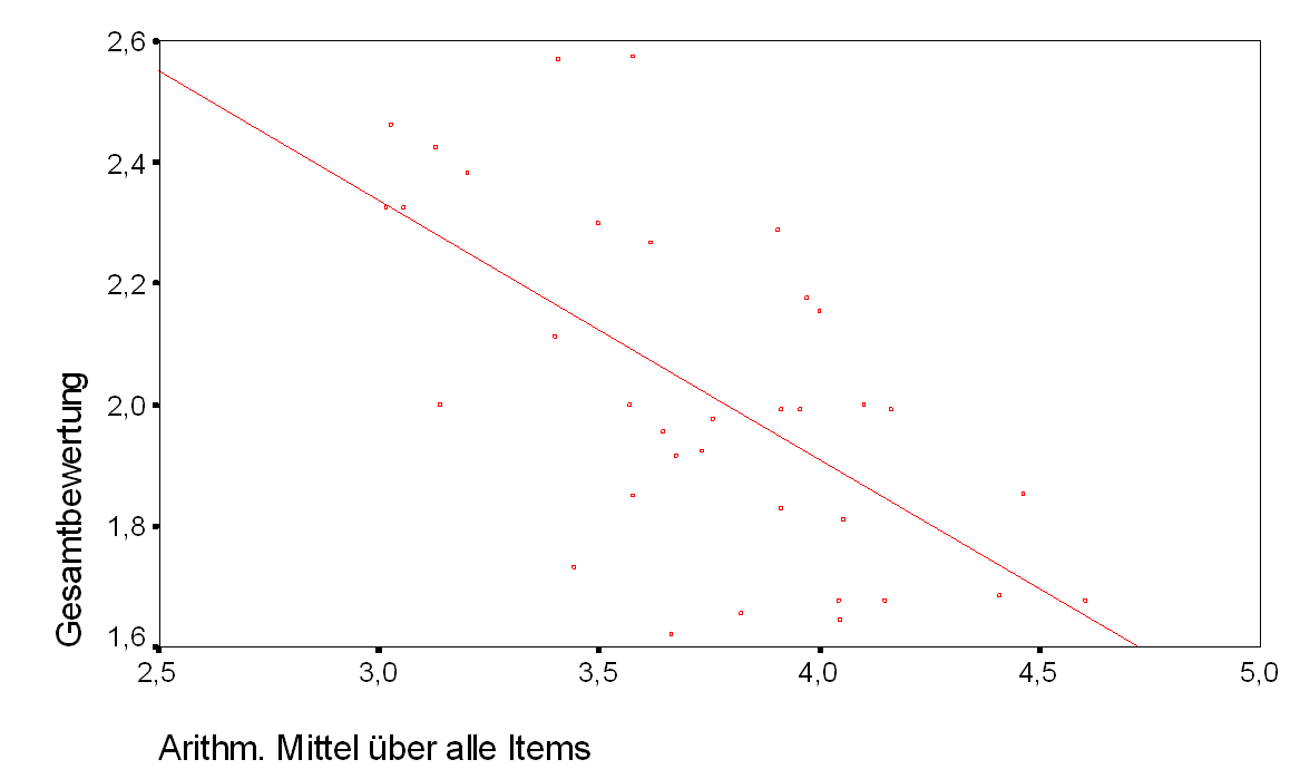 Null würde bedeuten, daß es einen Zusammenhang zwischen den Merkmalen Gesamtbewertung und der durchschnittlichen Bewertung der zwanzig Items gibt. Das Signifikanzniveau a liegt bei 0,05 %. Der Zusammenhang wird in einem Scatterplot (siehe Grafik 3) veranschaulicht. Die durchschnittlichen Bewertungen jedes einzelnen Studenten, bezüglich der Gesamtbewertung und der Bewertung der zwanzig Items, werden durch einen Punkt in dieser Grafik dargestellt: